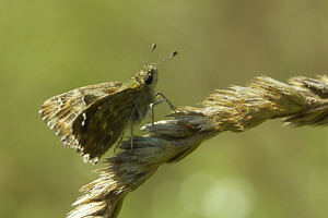 The Mallow Skipper is a butterfly of warm, grassy places, usually with rough vegetation. It is a mobile butterfly, that strays outside its usual habitat, and thus can be met in unexpected places. In warm summers, they migrate northwards and can be seen in warm, south-facing river valleys. The resident populations are usually small. The butterflies are often seen visiting flowers for nectar. They also spend a lot of their time basking in the sun, their wings widespread, showing to full advantage their beautiful purple to olive-green metallic sheen. Eggs are laid singly on the upperside of the leaves of mallows (Malva ssp.). The caterpillars thrive on this food, growing very quickly. This skipper has up to three or more broods per year. As winter approaches, the fully-grown caterpillars make a cocoon in the litter layer. They pupate in the spring.