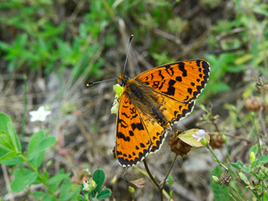 The Spotted Fritillary can be found on poor grasslands, steppe-like vegetation, and dry, rough vegetation near rocks and on slopes. Further, it is also seen on fallow agricultural land, or at the edges of fields. It uses a wide variety of plants as foodplant, plantains (Plantago spp.), toadflaxes (Linara spp.), speedwells (Veronica spp.), foxgloves (Digitalis spp.), woundworts (Stachys spp.), valerians (Valeriana spp.), and mulleins (Verbascum spp.). The female lays her eggs in clumps on the underside of the leaves, near to the ground. At first, the caterpillars feed communally in a loosely spun shelter, but they separate quite soon, either into smaller groups, or become solitary. The caterpillars hibernate alone, or in small groups, in a spun web. They pupate low down on the foodplant or in the vegetation. The Spotted Fritillary has one to three broods a year, depending on the geographical location and altitude of its breeding ground.