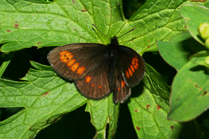 The Eriphyle Ringlet occurs locally in the Alps and is one of the smaller ringlets. It is a characteristic species of the north-facing slopes, occurring on rough, herbaceous vegetation in the alpine and sub- alpine zones, where there are plenty of alder (Alnus spp.) saplings. They are often found in places where the conspicuous plants Adenostyles alliariae and Masterwort (Peucedanum ostruthium) are growing. It uses Sweet-Vernal-grass (Anthoxanthum odoratum) and Tufted Hair-grass (Deschampsia cespitosa) as foodplants. Some of the caterpillars leave the egg before the winter, but the rest hibernate in the egg and emerge in the spring, when they all start feeding on grasses. In the autumn, they hibernate again and moult twice before pupating at the end of May.