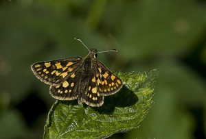The Chequered Skipper usually occurs on damp grassland at woodland margins, or where there is woodland nearby, including road verges, also on the drier areas of raised bogs and at their edges. Breeding grounds are also known in somewhat drier locations at higher altitudinal levels. Populations are usually small. The female lays her eggs one by one on the blades of coarse-leaved grasses. The caterpillars spin folded grass leaves together into a little tube, in which they spend most of their life, leaving it only to feed. Those who know what to look for, can find their traces, small half-moons nibbled away from the edge of the grass-blade. The caterpillars hibernate in a more substantial tube-like shelter. It pupates, its papery, pale-yellow pupa suspended from withered grass by a silken girdle. The Chequered Skipper is single-brooded.