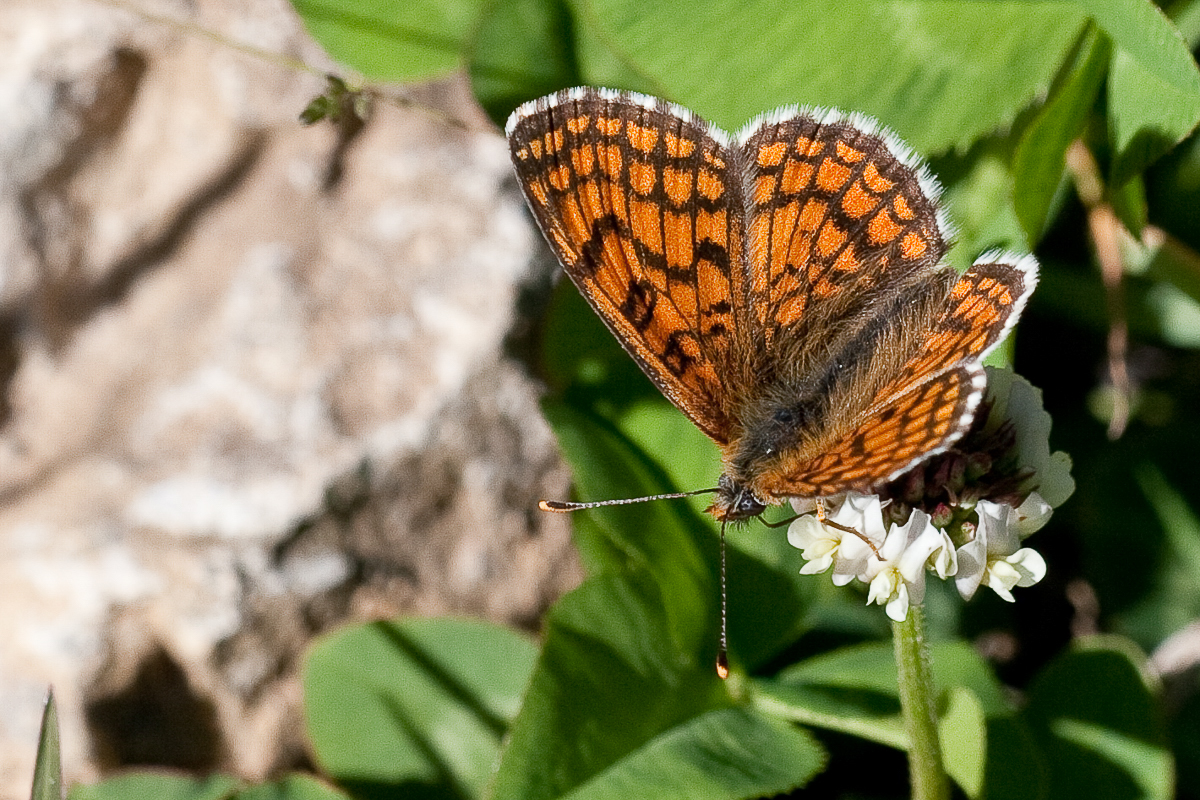 The Meadow Fritillary occurs in both dry and moderately damp habitats in many sorts of open, grassy, flower-rich places near woodland. Plantains (Plantago spp.) are the main foodplants, especially Ribwort Plantain (P. lanceolata). The eggs are laid in clusters on the underside of the leaves. The caterpillars feed and hibernate communally in a silken shelter, only separating in the last larval instar. They then look for a safe place to pupate, low down on the foodplant. The Meadow Fritillary usually has two generations a year, but only one in cool breeding grounds.