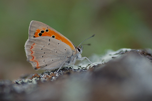 The Small Copper is a very common, widespread butterfly. It is found on all sorts of grasslands and heathlands, roadsides and along the banks of canals. The butterflies often visit flowers, and the males, perched on a tall blade of grass, defend their territory fiercely, flying out at other males of its sort. Eggs are laid on different species of acidic sorrels, mainly Common Sorrel (Rumex acetosa). This butterfly species overwinters as a caterpillar. In the north of its range, the Small Copper has two generations a year, whereas in the southern part, it may have three or four.
