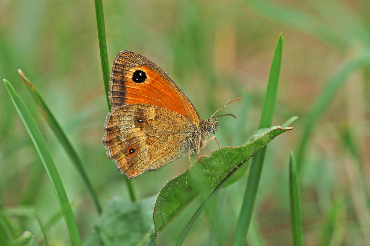 The Gatekeeper occurs on many different types of grassland. Mostly, it chooses rather rough, dry to damp vegetation, situated beside woodland or scrub, or not far from them. The butterflies are fond of basking in the sun on scrub, and are often seen visiting flowers. The female lays her eggs singly on the leaf-blades of nearly all soft grasses, such as Cock’s-foot (Dactylus spp.), fescues (Festuca spp.), bents (Agrostis spp.), and Rye-Grass (Lolium spp.). The caterpillar avoids bright sunlight, and feeds mostly on grasses growing in the shade. When half-grown, it hibernates in a tussock of grass. It completes its growth the following year, and pupates low down in the vegetation. The Gatekeeper is single-brooded.